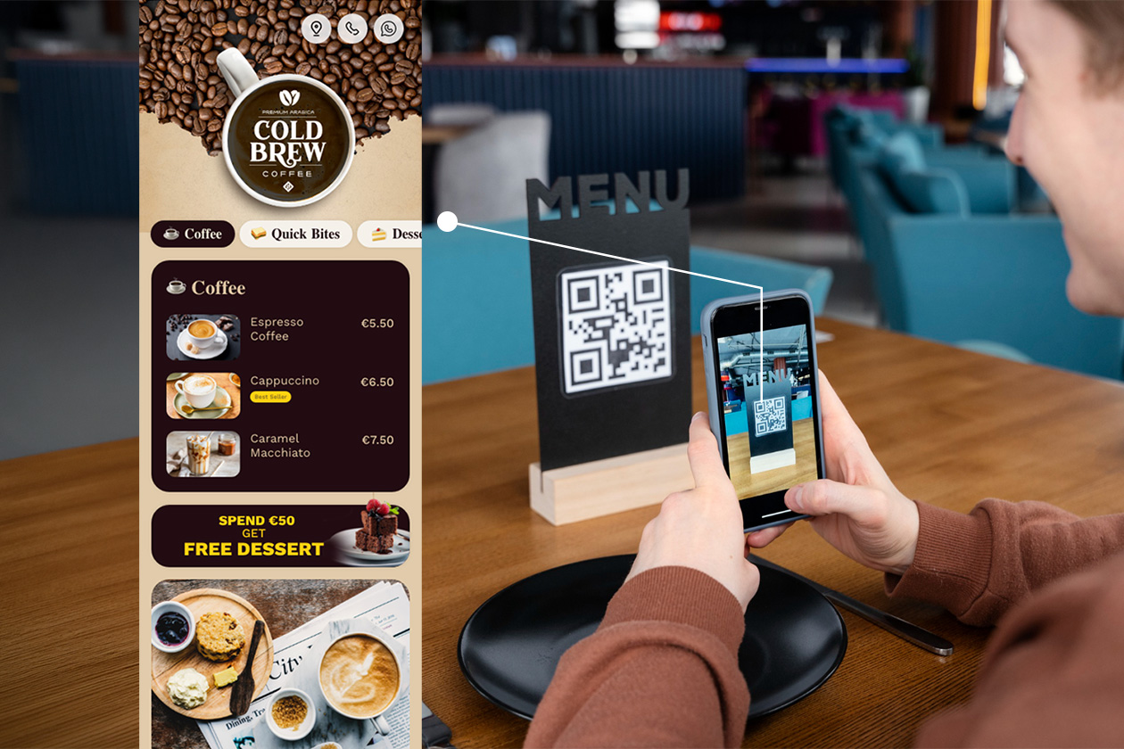 Instead of handing over a printed menu, you simply place a QR code on tables, standees, or walls.